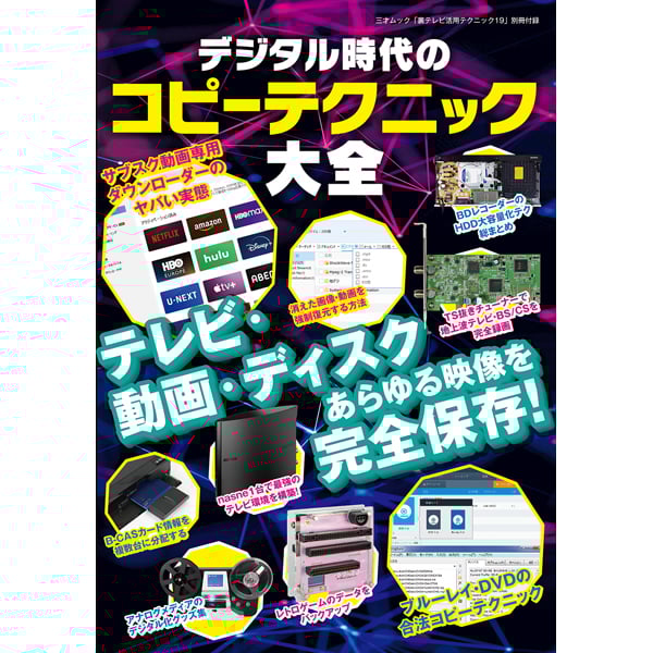 地上波・BS/CSのデジタル放送、ブルーレイ・DVD、さらにはレコーダーの内蔵HDDやゲームカートリッジのデータまで……あらゆる映像・コンテンツの合法バックアップテクニックを公開! 現在は廃番になってしまった往年のコピーツールも“資料”としてまとめました。