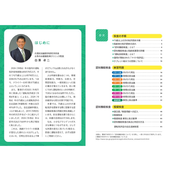 本書では、検査の手順や講習の内容の説明をはじめ、認知機能検査の練習問題4題と本試験形式の模擬テストを掲載しています。