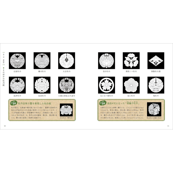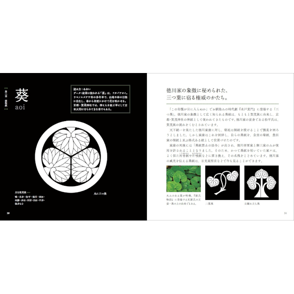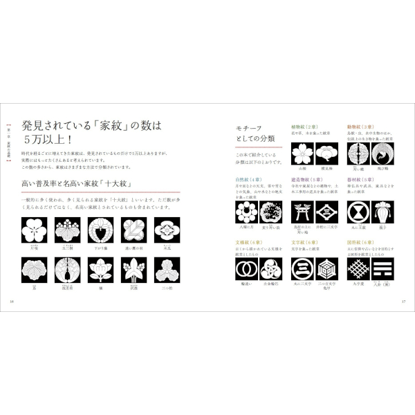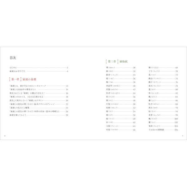 「家紋」は、家を守るためのシンボルマーク/「家紋」は1000年の歴史をもつ/発見されている「家紋」の数は5万以上!/「家紋」のほかにも、さまざまな紋がある/変化して派生していく「家紋」のデザイン/「家紋」の変化の例〈その1〉基本デザインのアレンジ/「家紋」の見立てと擬態/「家紋」の変化の例〈その2〉外枠の付加・基本の増殖など/家紋を探してみよう