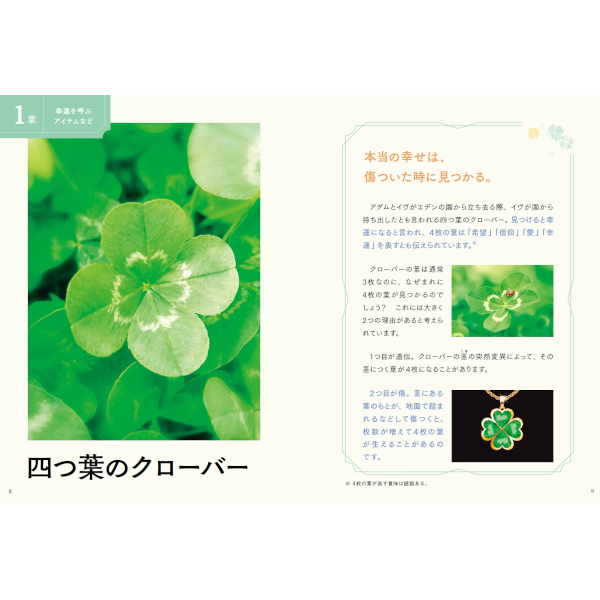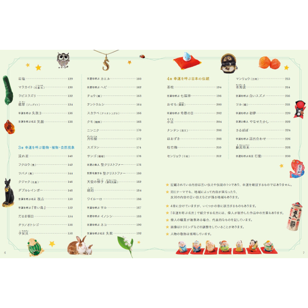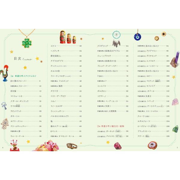 流れ星/フクロウ(梟)/ツバメ(燕)/クジャク(孔雀)/ダブルレインボー/幸運を呼ぶ名言 視点/幸運を呼ぶ『青い鳥』/だるま朝日/タツノオトシゴ/子安貝/幸運を呼ぶ カエル/幸運を呼ぶ ヘビ/チョウ(蝶)/テントウムシ/スカラベ(タマオシコガネ)/クモ(蜘蛛)/ニンニク/月桂樹/スズラン/サンゴ(珊瑚)/幸運と偉人 聖クリストファー/世界を旅する 聖クリストファー/天使の梯子(薄明光線)/琥珀/ワイルーロ/幸運を呼ぶ サル/幸運を呼ぶ イノシシ/幸運を呼ぶ ネコ/幸運を呼ぶ名言 失敗