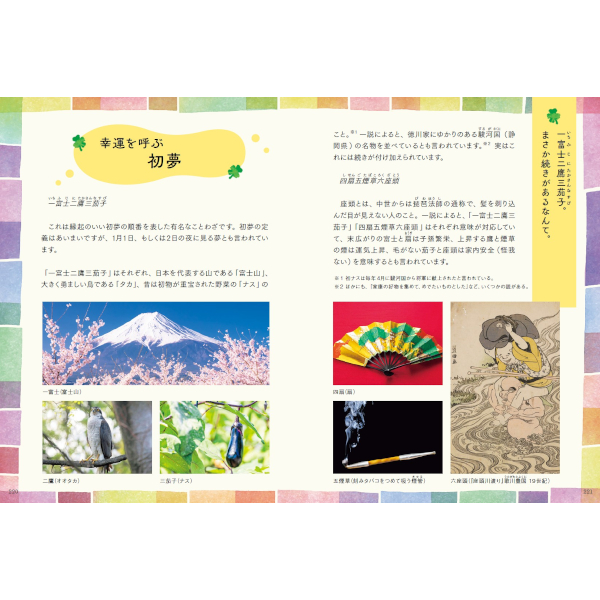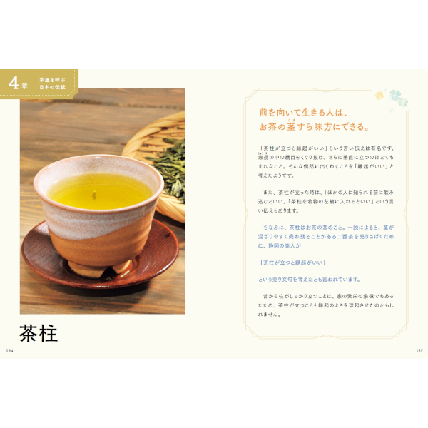 茶柱/幸運を呼ぶ 七福神/おせち(御節)/幸運を呼ぶ 奇数の日/小豆/ナンテン(南天)/ほおずき/松竹梅/センリョウ(千両)/マンリョウ(万両)/青海波/幸運を呼ぶ 白いスズメ/ツル(鶴)/幸運を呼ぶ 初夢/幸運と偉人 やなせたかし/さるぼぼ/幸運を呼ぶ 語呂合わせ/蘇民将来/幸運を呼ぶ名言 行動