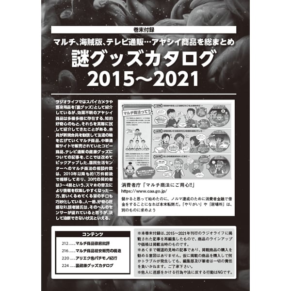 紙の雑誌版限定で、隔月で巻末付録を付けています。9月号はマルチ商品、テレビ通販グッズ、健康器具のレビュー記事の総まとめ。2015~2021年掲載の記事からピックアップしました。